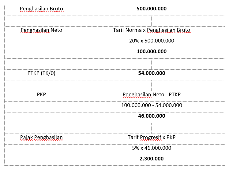Andi merupakan seorang pengusaha di bidang instalasi minyak dan gas yang berdomisili di Denpasar sejak 2019, belum menikah, dan tidak memiliki tanggungan. Selama tahun 2021, Andi memperoleh penghasilan bruto sebesar Rp500.000.000 dari usahanya. Mengikuti PER-17/PJ/2015, tarif norma Andi adalah 20% (tarif norma ditentukan oleh profesi dan domisili).
